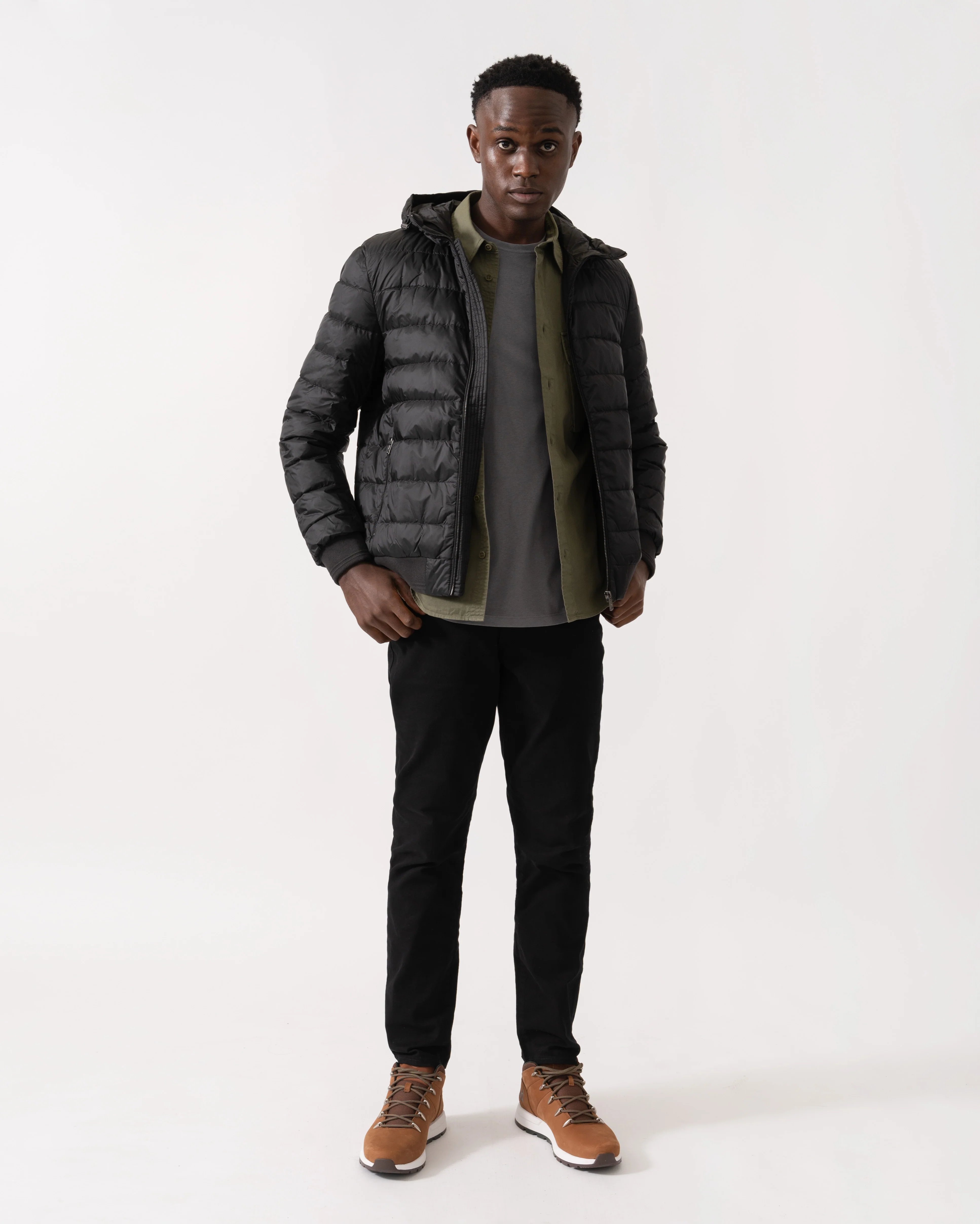 The men's Control jacket in black offers convenience without compromise. Its sleek design features 750 power down-filled, water-repellent nylon for lightweight warmth. Ready for anything, this jacket features a hood for extra protection during autumn-winter weather.