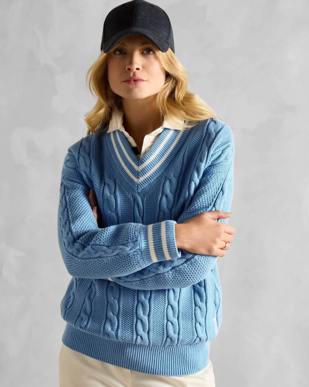 Drawing style influence from the world of cricket, the Dibbly relaxed fit knitted jumper will help you achieve a sporty look this season. It carries details synonymous with the sport including a deep ribbed V-Neck with contrasting stripes and uses a classic cable knit technique to the body and sleeves along with a textured moss stitch throughout. Its 100% cotton construction makes it an enduring piece that will live long in your wardrobe. It's completed with a ribbed hem and ribbed cuffs with striped detailing.